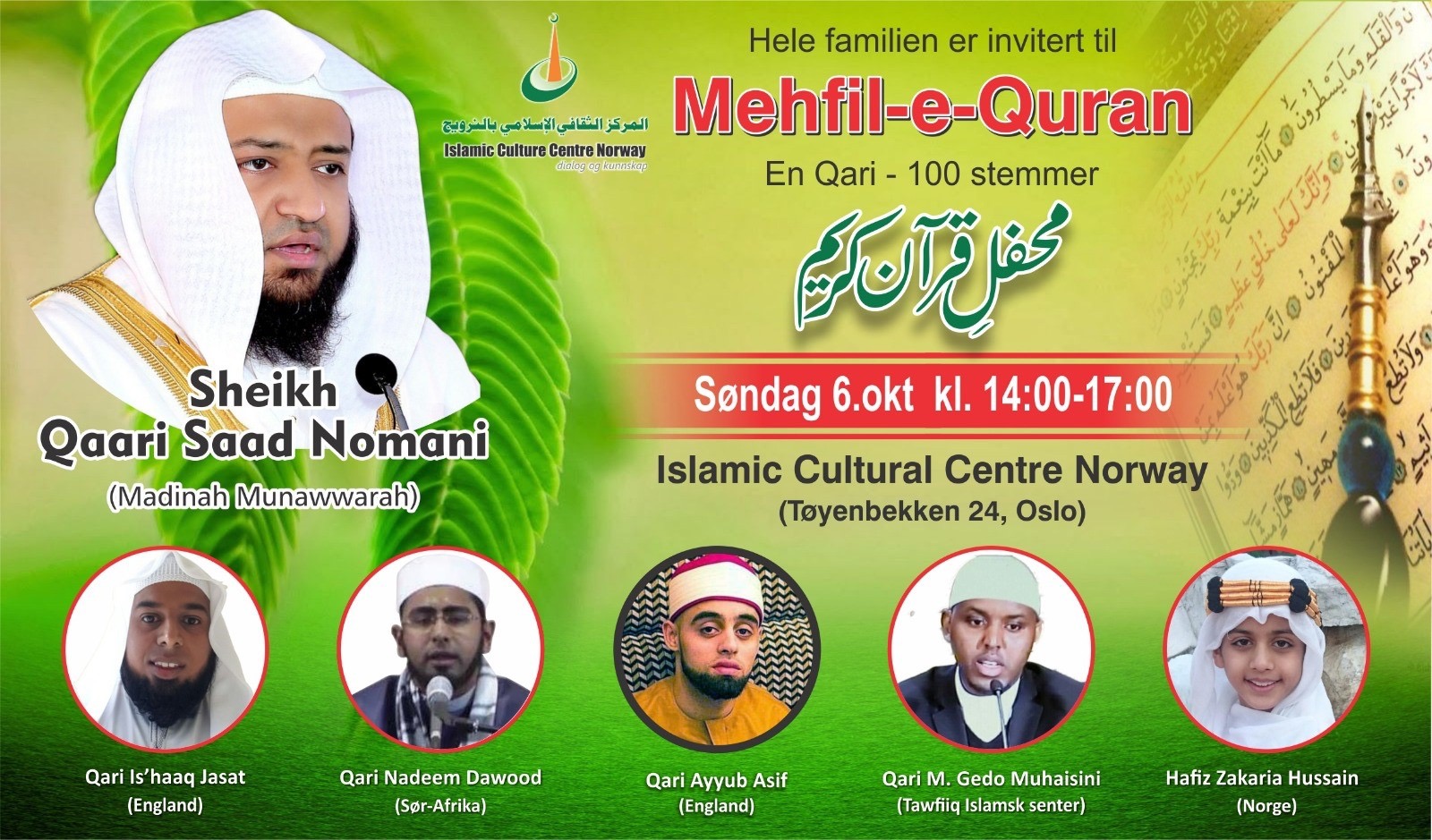 Islamic Cultural Centre Norway Tøyenbekken 24,OsloVi gjentar forårets suksess med Mehfil-e-Quran og får i år også gleden av å invitere den respekterte Shaykh Qari Saad Nomani fra Madinah Munawwarah, som har evnen til å etterligne...