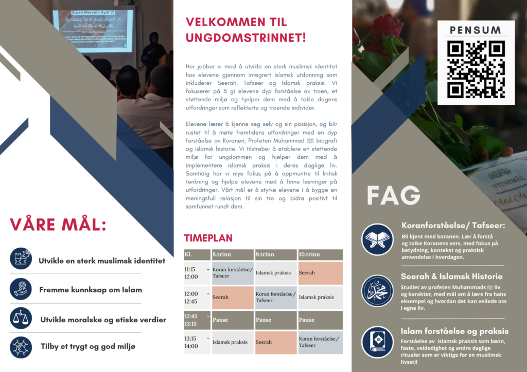 Elevene er innom alle disse 4 områdene i løpet av en undervisningsdag. Det er viktig at elevene blir kjent med våre hellige skrifter fra tidlig av. Hifz-delen vil gi elevene innblikk og innføring i den hellige Koranen, hadith-delen vil gjøre dem kjent med hadith-samlingene og vår kjære Profet Muhammad ﷺ, Salah-delen vil gi dem innføring i teori og praksis rundt bønn. Videre vil de hver uke gjennomgå et islamsk tema i dybden som vil gi elevene grundig opplæring i islam.
